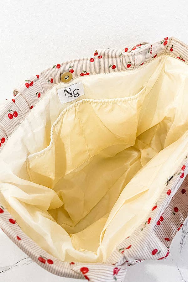 The Stevie Tote Bag is your perfect seasonal companion, blending cherry charm with cozy cottagecore style. Made from lightweight corduroy with a playful red cherry print, this fully lined tote holds everything you need with ease. Stay organized with two interior and two exterior pockets ideal for your phone, water bottle, or other essentials. Sized at 14" x 11.81" x 4.72", it's ideal for everyday use, beach trips, or work. Add a cute purse charm for extra flair!